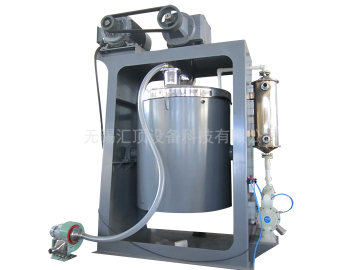 一種制造微粉的立式球磨機(jī),它是通過(guò)電機(jī)驅(qū)動(dòng)立式減速機(jī),通過(guò)聯(lián)軸節(jié),帶動(dòng)內(nèi)轉(zhuǎn)子研磨裝置旋轉(zhuǎn),使磨球、磨料、水混合液懸浮研磨。研磨過(guò)程中,水、磨料混合液通過(guò)循環(huán)系統(tǒng)連續(xù)循環(huán),直到達(dá)到標(biāo)準(zhǔn)。本裝置的特征在于:該內(nèi)轉(zhuǎn)子研磨裝置是由若干個(gè)沿?cái)嚢栎S螺旋上升的金屬攪棒垂直安裝的。