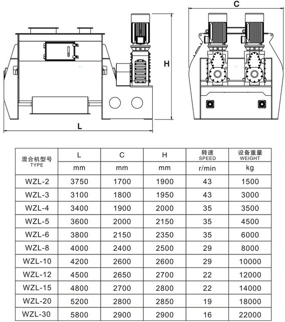 無重力混合機裝載著兩根同時異向向外旋轉(zhuǎn)的平行槳葉軸,每根軸上搭載十字槳葉,在驅(qū)動裝置的同步作用下,兩根的十字槳葉軸的運行軌跡成相交關(guān)系,且錯位嚙合。驅(qū)動裝置驅(qū)使槳葉軸快速旋轉(zhuǎn),旋轉(zhuǎn)的槳葉產(chǎn)生離心力,將物料有效拋灑至筒內(nèi)上空部分,達(dá)到拋物線的高點后下落(拋物線的高點也稱為瞬間無重力狀態(tài)),物料再受槳葉的驅(qū)趕,在筒體內(nèi)往復(fù)循環(huán)混合,并受雙軸的嚙合空間混合、剪切、分離,致使物料快速混合均勻。